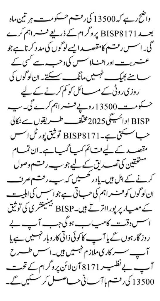 It should be noted that the amount of 13500 will provide every three months by the government through the BISP 8171 program. The purpose of this amount is to help such people who cannot beg in front of anyone due to poverty and poverty. 13500 will provide by the government to reduce the livelihood problems of these people. This BISP payment 2025 can withdrawn in different ways. 8171 BISP Validation Portal has established for this purpose.