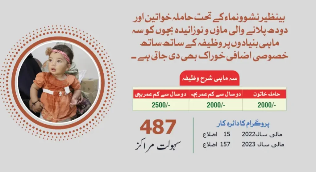 Nashonuma Sahulat Centers are places where mothers of pregnant women and newborns are provided with financial support and additional food every quarter. 478 facility centres have set up in more than 70 districts of Pakistan.