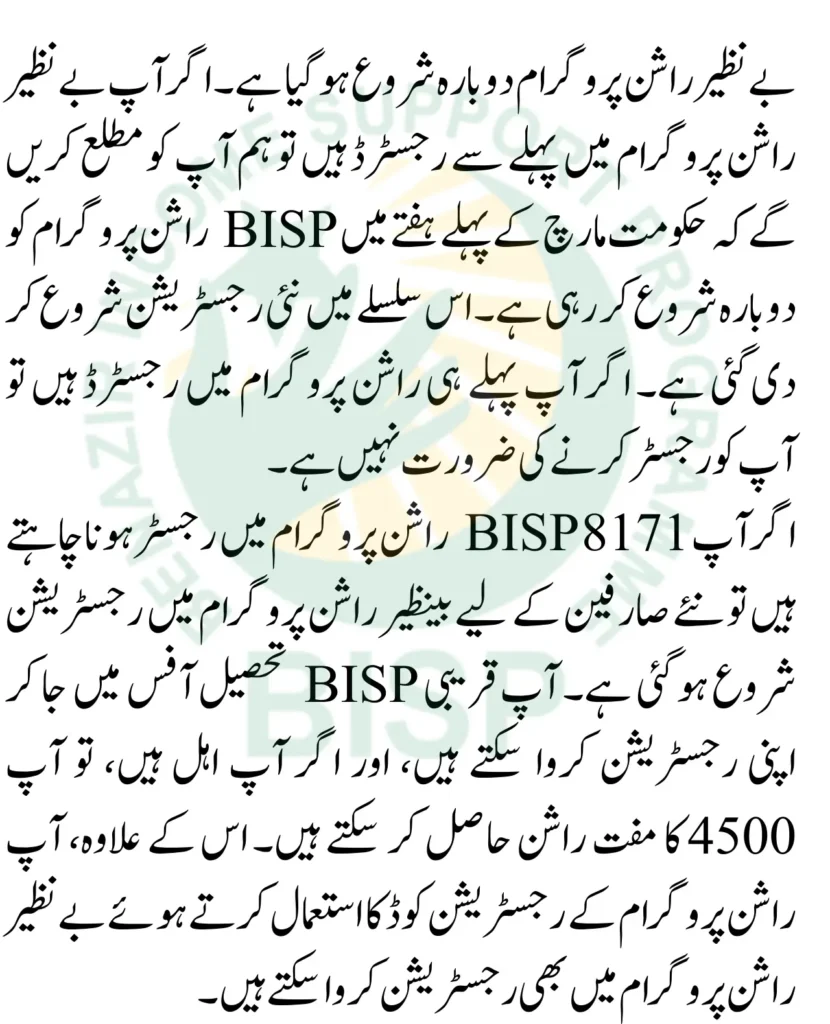 Registration in the Benazir Rashan Program has started for new users. If you want to register in the 8171 BISP Rashan Program, you can go to the nearest BISP Tehsil Office and register. If you are eligible, you can get a free Rashan of 4500. You can also register in the Benazir Rashan Program using the BISP Rashan Program Registration Code.