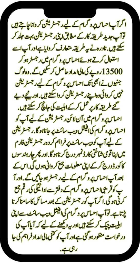 احساس پروگرام میں رجسٹریشن نادرا کے ذریعے شروع ہو گئی ہے، جس کے لیے آپ کو اپنے اصل قومی شناختی کارڈ کے ساتھ نادرا آفس جانا ہوگا۔ تصدیق کے بعد، آپ کو نادرا سے تصدیقی سرٹیفکیٹ حاصل کرنے کے لیے قریبی احساس پروگرام آفس میں جا کر اپنی رجسٹریشن مکمل کرنی ہوگی۔ اس کی تصدیق کرنے کے بعد، احساس پروگرام کا نمائندہ آپ کی رجسٹریشن میں سہولت فراہم کرے گا۔ آپ آسانی سے احساس پروگرام کے لیے اہل ہو جائیں گے اور 13500 کی سہ ماہی امداد حاصل کرنے کے اہل ہوں گے۔