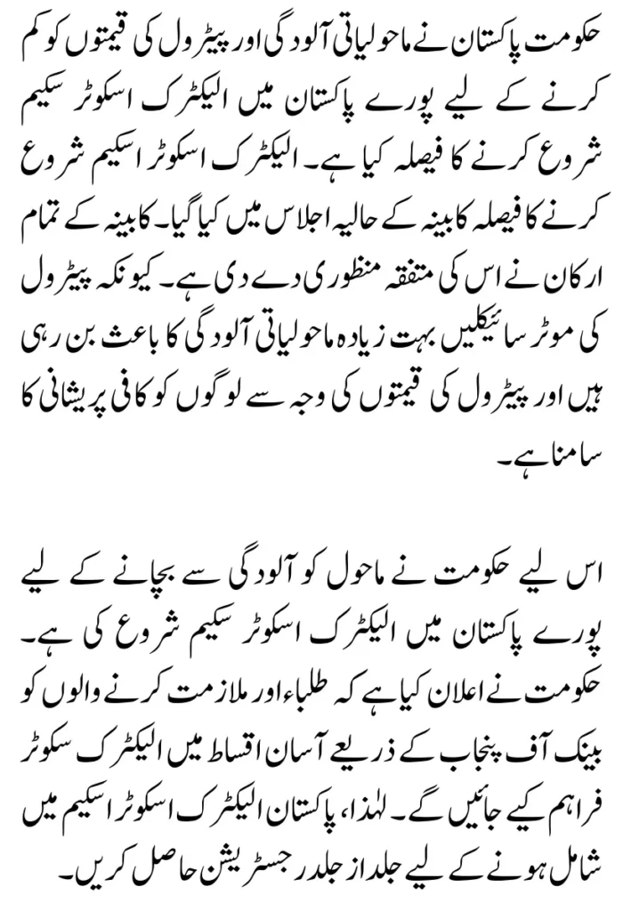 وزیراعظم پاکستان نے پاکستان میں ماحولیاتی آلودگی پر قابو پانے کے لیے ای اسکوٹر اسکیم شروع کرنے کا فیصلہ کیا ہے۔ لہٰذا وہ طلباء اور جاب ہولڈرز جو اپنی موٹر سائیکل حاصل کرنا چاہتے ہیں وہ جلد از جلد ای بائیک پورٹل کے ذریعے خود کو رجسٹر کرائیں اور پاکستان الیکٹرک بائیک اسکیم میں شامل ہونے اور آسان اقساط میں موٹر سائیکل حاصل کرنے کے اہل ہوجائیں۔ حکومت کی جانب سے اعلان کیا گیا ہے کہ الیکٹرک بائیکس پانچ سال کی آسان اقساط میں فراہم کی جا رہی ہیں.