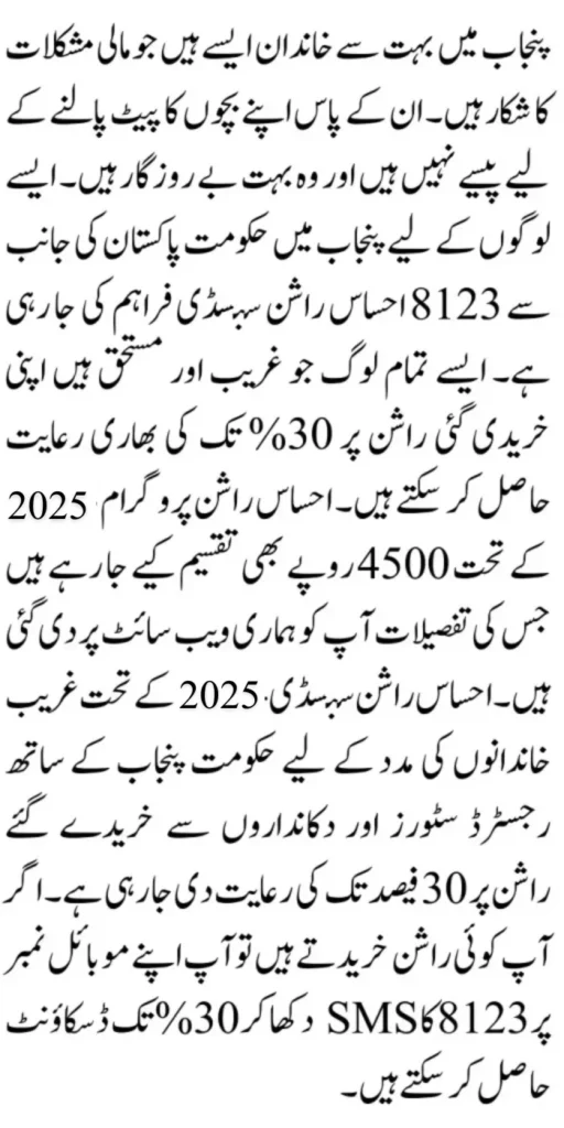 Under Ehsaas Ration Subsidy, a discount of up to 30% is being give on rashan purchase from utility stores and shopkeepers register with the Punjab government to help poor families. If you buy any ration, you can get up to 30% discount by showing the message of 8123 on your mobile number.