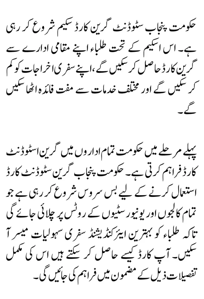 The government of Punjab is starting the green card scheme. Under this scheme, students will be able to get a green card from their local institution, reduce their travel expenses, and benefit from various services for free.